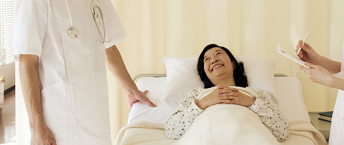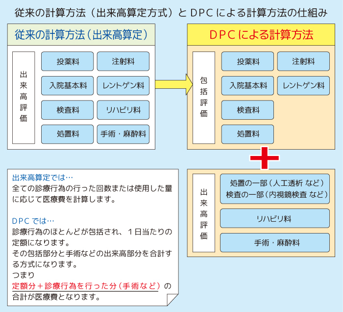 DPCとは、入院される患者さんの病状などをもとに手術や処置の内容に応じて定められた1日当たりの点数を基本に医療費を計上する新しい方式です。従来は、投薬・注射・検査などの診療行為を行った分を合計して計算する「出来高算定」方式でしたが、DPCでは1日当たりの点数が決められており、投薬・注射・検査などの診療行為はその決められた点数に包括されています。したがいまして、投薬・注射・検査などの診療行為を多く行う必要があった場合でも、1日当たりの包括診療費は変わりません。ただし、手術などの医師の専門的な技術を必要とする分野は従来の出来高算定方式で医療費を計算いたします。