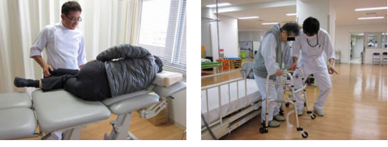 - 脳の血管が詰まり手足が動きにくくなった、事故や転倒によって骨折した、寝たきりで全身が弱った方などに、手・足・体の運動や歩く練習等を行い、再び自立した日常生活を送れるようにお手伝いをします。