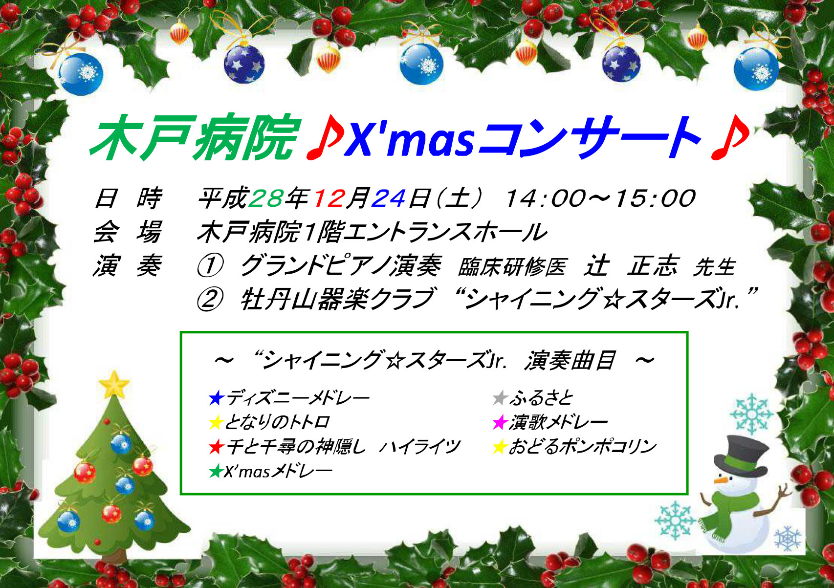 ☆木戸病院「クリスマスコンサート」12月24日開催のお知らせ☆